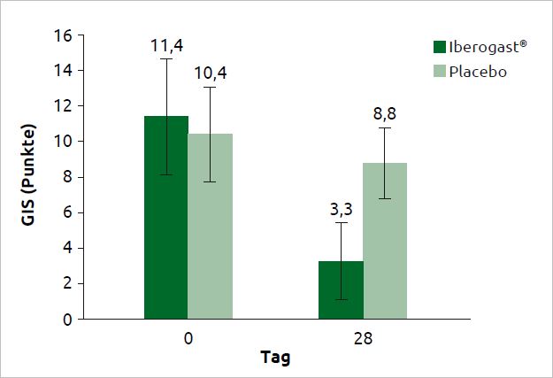 In der placebokontrollierten, multizentrischen, doppelblinden, randomisierten Phase-II-Studie wurden bei 60 Patienten mit funktioneller Dyspepsie die Wirksamkeit eines Phytotherapeutikums (Iberogast Classic, STW 5) und eines Forschungspräparates (STW 5-S*) gegen ein Placebo untersucht. Als Hauptzielparameter wurde die Veränderung des gastrointestinalen Symptomenprofils (GIS) bewertet. Der Schweregrad der Einzelsymptome wurde anhand der validierten Likert-Skala bewertet. Nach 4-wöchiger Behandlung zeigte Iberogast Classic eine signifikant höhere Wirksamkeit als das Placebo.