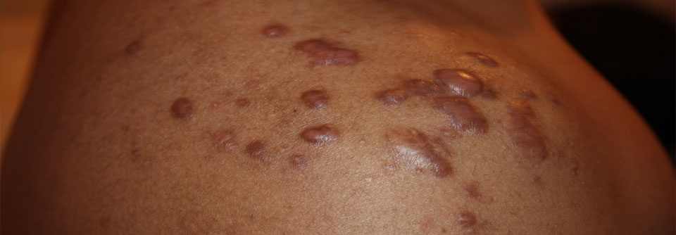 Keloide können auch ohne Verletzung entstehen und enorme Größe annehmen. Die genauen Ursachen sind unklar, die therapeutischen Optionen begrenzt.