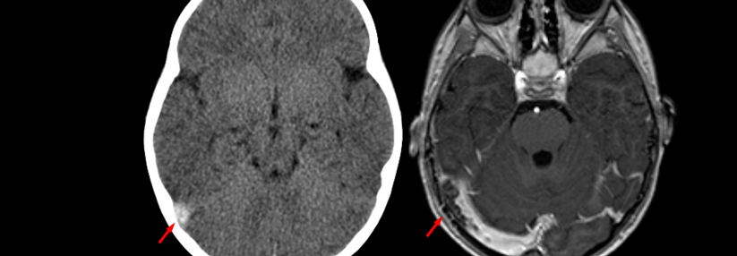 CT ohne und MRT mit Kontrastmittel zeigen beide den Befund einer SVT (Pfeil) beim selben Patienten.