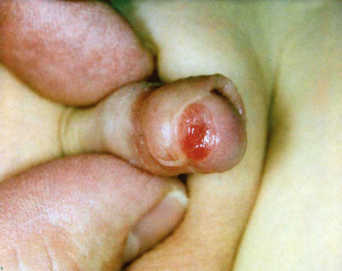 Bei 96 % der neugeborenen Jungen sind Eichel und Vorhaut noch fest miteinander verbunden (s. Abb. 1). Die gewaltsame Trennung schädigt also zwangsläufig die Glans, warnt der Experte. Eine Phimose besteht bei ca. jedem zweiten Jungen im ersten Lebensjahr, bei rund 10–20 % bis zum dritten und bei etwa 1 % im 18. Lebensjahr.