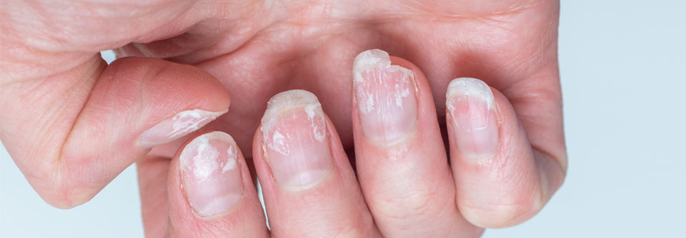 Bei der Untersuchung in der Ambulanz des Helios St. Elisabeth Klinikums Oberhausen fielen an sämtlichen Nagelplatten symmetrische, unscharf begrenzte Querbänder auf. Sie waren von weiß-grauer Farbe und hatten eine Breite von bis zu 0,3 cm, berichten Dr. Ulrich Wehry und Koautoren. Die Dermatologen diagnostizierten eine Leukonychia transversalis, auch bekannt als Mees-Nagelbänder.