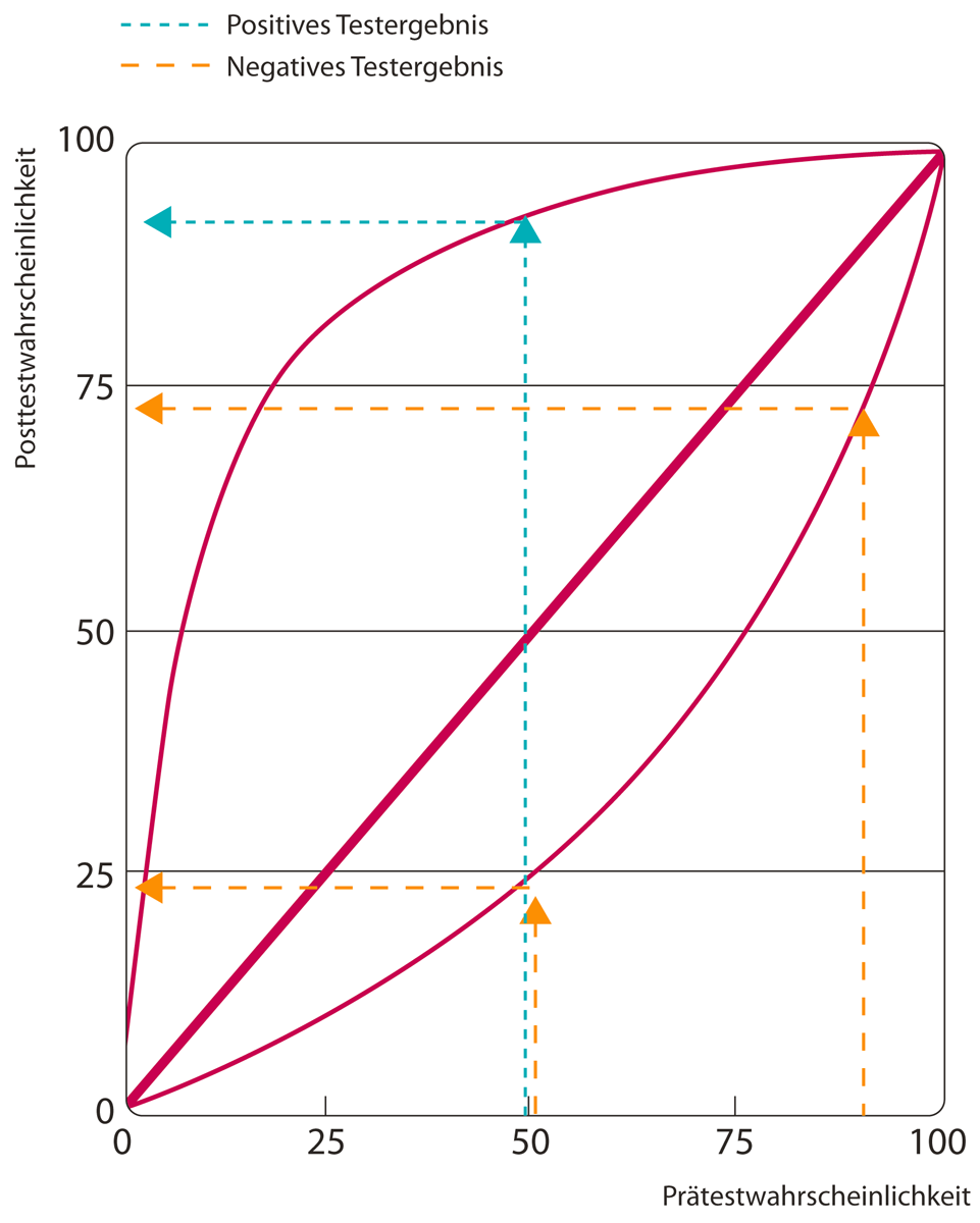Mit einer Kombination beider Größen lassen sich die Wahrscheinlichkeitsverhältnisse (likelihood ratio, LR+ bzw. LR-) errechnen, also die Aussagekraft eines positiven oder negativen Tests. Je weiter die positive LR (LR+) den Wert 1 übersteigt, desto besser eignet sich das Verfahren zur Detektion Kranker, bei einem Wert von 10 besteht eine als starke Evidenz für das Vorliegen der Erkrankung.