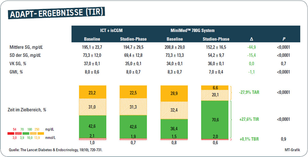 Bedingt durch das AHCL-System kam es zu einer Senkung des HbA1c um 1,54 % im Vergleich zum Ausgangswert sowie 1,42 % im Vergleich zur Kontrollgruppe. Während in der Kontrollgruppe keine Person einen HbA1c unter 7 % erreichte, waren es in der Therapiegruppe 27,8 %. Zusätzlich zeigte sich eine eindrucksvolle Verbesserung der TiR sowie die Vermeidung von akuten Komplikationen wie Hypoglykämien, Ketoazidosen und anderen schweren unerwünschten Ereignissen.