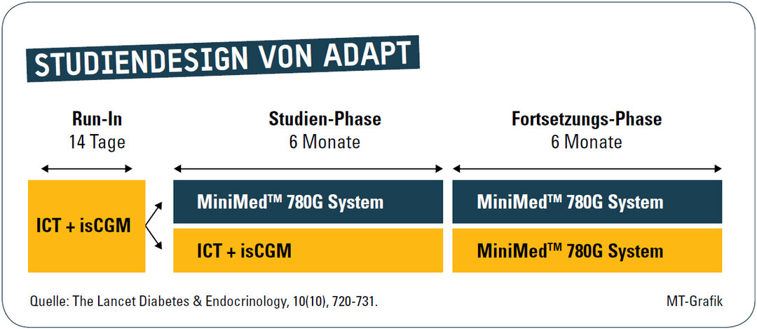 Die ADAPT-Studie („Advanced Hybrid Closed Loop Study in Adult Population with Type 1 Diabetes“) wurde als randomisierte kontrollierte Studie mit 82 Patienten an 14 Zentren in drei europäischen Ländern (Frankreich, Deutschland und Vereinigtes Königreich) durchgeführt. Hierzulande waren vier Zentren beteiligt (Dres. Kolassa, Keuthage, Vortherms, Kröger).