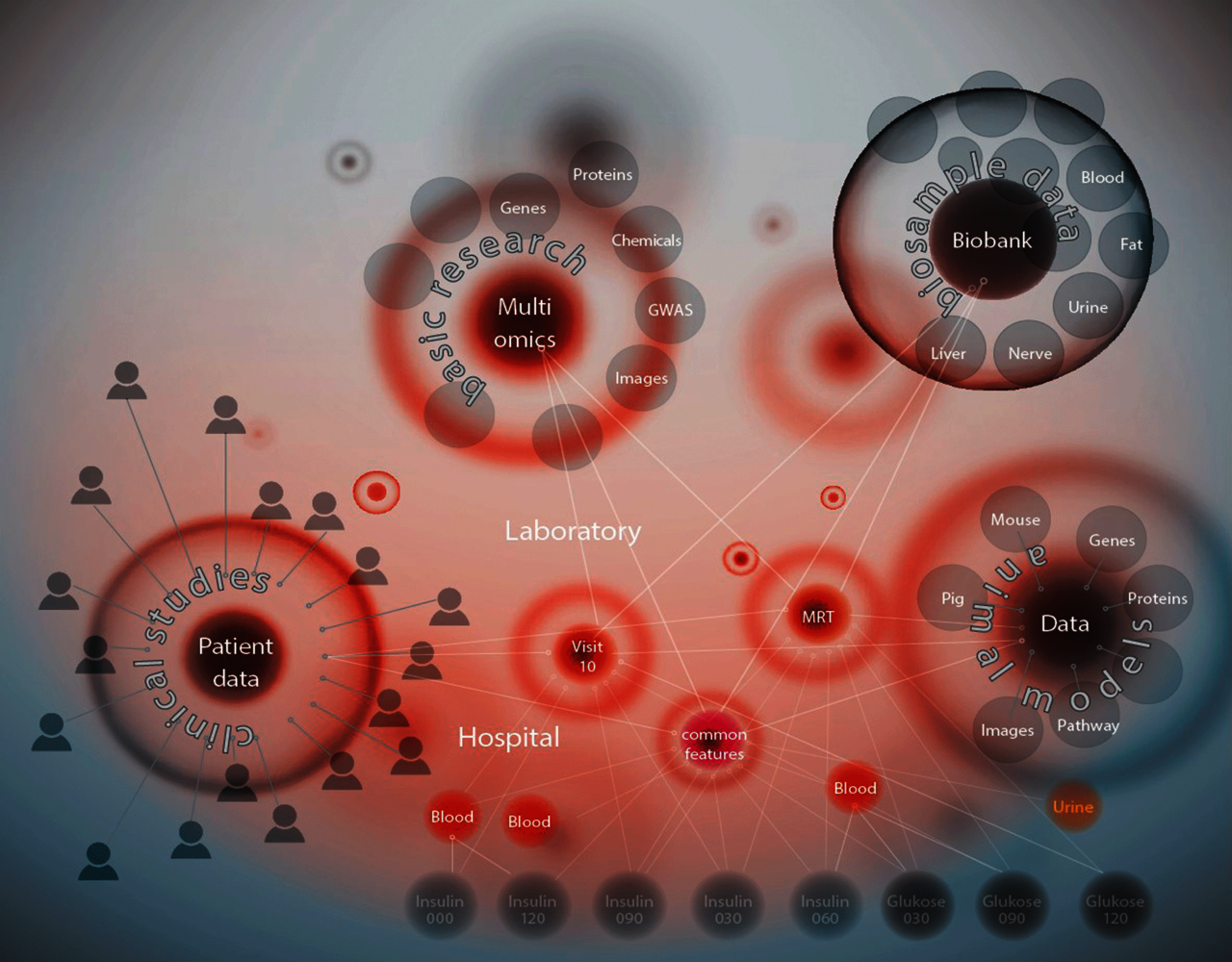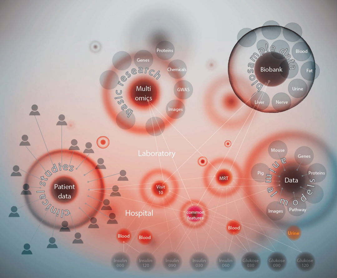 In der nächsten Projektphase ergänzten Wissenschaftler die humanen Daten aus der klinischen Forschung mit hochstandardisierten Daten aus Tiermodellen, z.B. aus Mäusen. Das dient dazu, Gemeinsamkeiten zu erkennen und Rückschlüsse zu ziehen. Die (Meta-)Daten wurden um disziplinübergreifende Forschungsdaten aus öffentlichen Quellen erweitert – dazu gehören Daten zu anderen relevanten Krankheiten. Diese Verknüpfung erlaubt es, Schlussfolgerungen für das humane System zu ziehen und Ähnlichkeiten bei einzelnen Genen und Stoffwechselvorgängen zu untersuchen. Hierbei suchen Wissenschaftler Antworten auf Fragestellungen wie: Welcher Diabetes-Typ lässt sich auf welche Gene zurückführen? Wie wirken sich externe Faktoren aus?