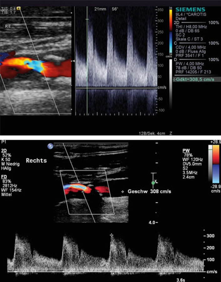 Der Ultraschall ist die geeignete Methode, um Karotisstenosen zu diagnostizieren und im weiteren Verlauf zu kontrollieren. Auf diese Weise lassen sich mit hoher Wahrscheinlichkeit harmlose von potenziell gefährlichen Gefäßveränderungen unterscheiden – vorausgesetzt, der Untersucher verfügt über eine entsprechende Expertise. Liegen vaskuläre Risikofaktoren vor oder gibt es ein familiäres Risiko für eine früh auftretende kardiovaskuläre Atherosklerose (bei männlichen Blutsverwandten < 55 Jahren und bei weiblichen < 65 Jahren), kann eine Duplexsonografie durchgeführt werden.
