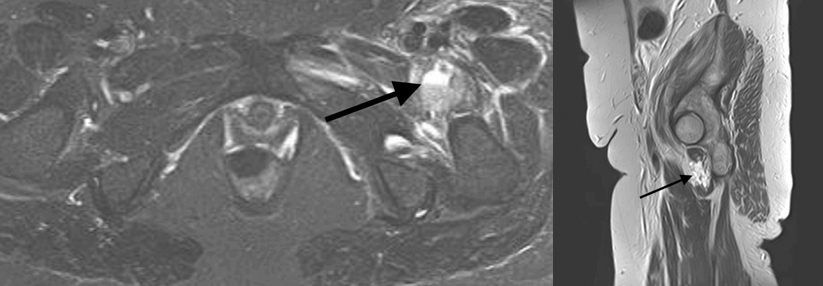 Röntgenologisch zeigt sich im Sitzbein eine tumoröse Auftreibung mit angedeuteter Periostreaktion (Abb. 1). Im Kontrastmittel-MRT stellt sich im Os ischii eine hypodense Läsion dar (Abb. 2). Das postoperative MRT ergibt keine Hinweise auf ein Rezidiv (Abb. 3).