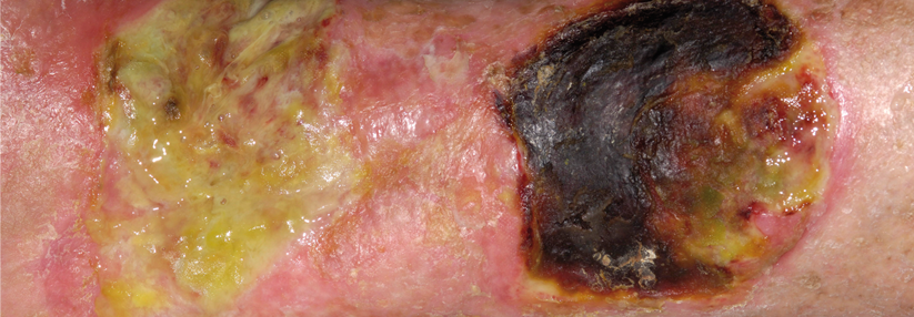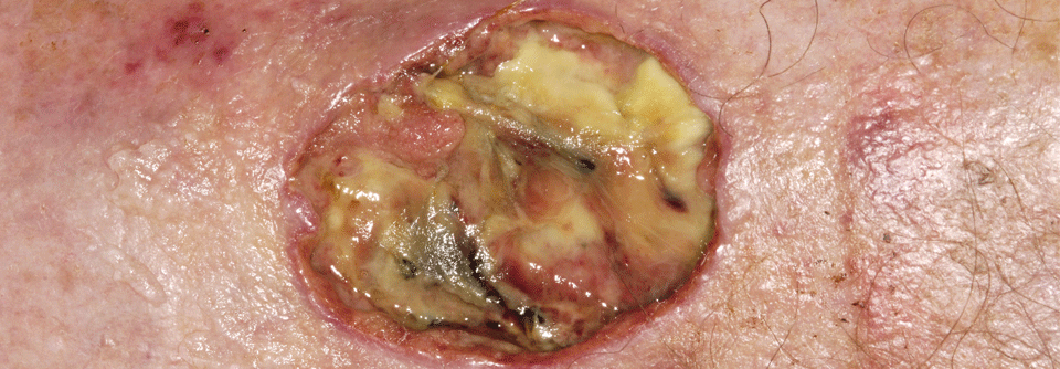 Die Dermatologen bemerken einen schmierig belegten Wundgrund der Ulzeration sowie einen erythematös-lividen aufgeworfenen Randwall. Umgeben ist die Läsion von rötlich-bräunlichen Hyperpigmentierungen, berichtete Assistenzärztin…