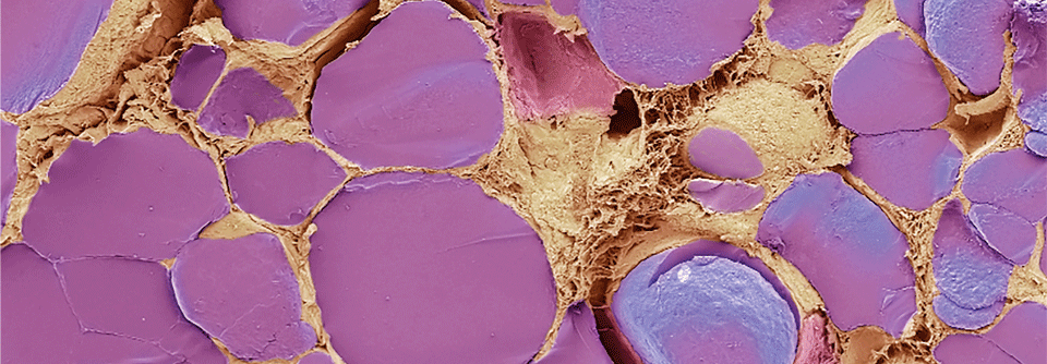 Ein etwas anderer Blick auf die Schilddrüse. Dieses rasterelektronenmikroskopische Bild zeigt diverse Follikel (orange) mit den hormonbildenden Epithelzellen (grün) und Bindegewebe (rot).