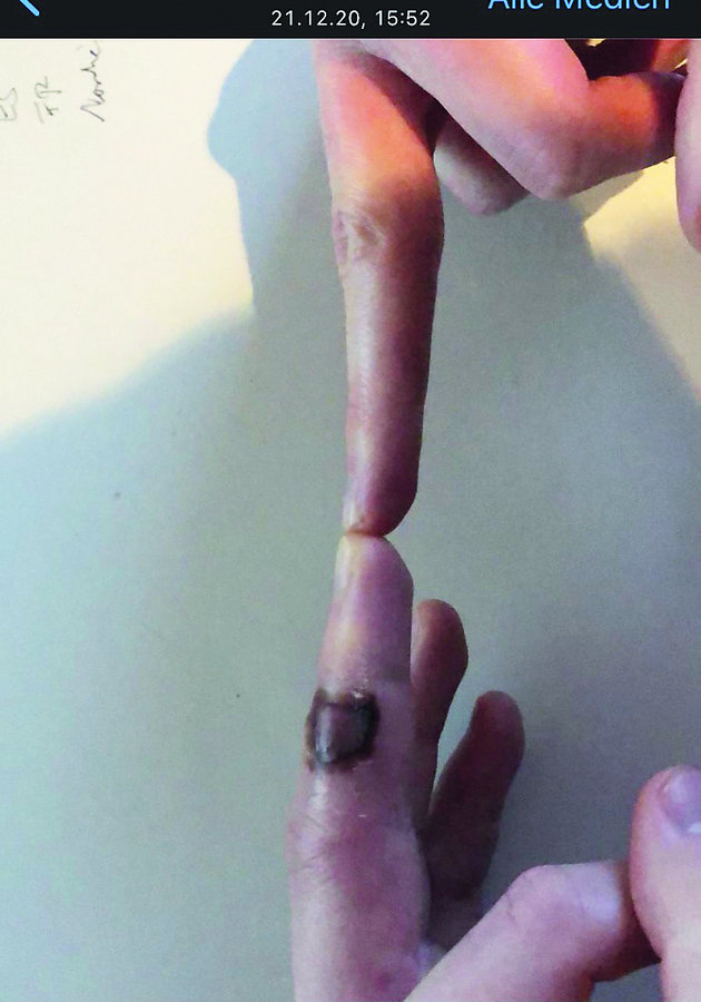 Anfang Dezember 2020 entwickelte ein zu diesem Zeitpunkt 30-jähriger Mann (Nichtraucher) akut Schmerzen im Zeige- und Mittelfinger der linken Hand, hauptsächlich im Bereich der Mittelphalanx. Die Beschwerden waren verbunden mit spindelartigen Schwellungen und blassen bzw. lividen Verfärbungen. Im weiteren Verlauf kam es zu einer Nekrose an der Dorsalseite des Mittelgliedes des Zeigefingers. Eine Beugung im PIP-Gelenk war nicht bzw. nur sehr eingeschränkt möglich.