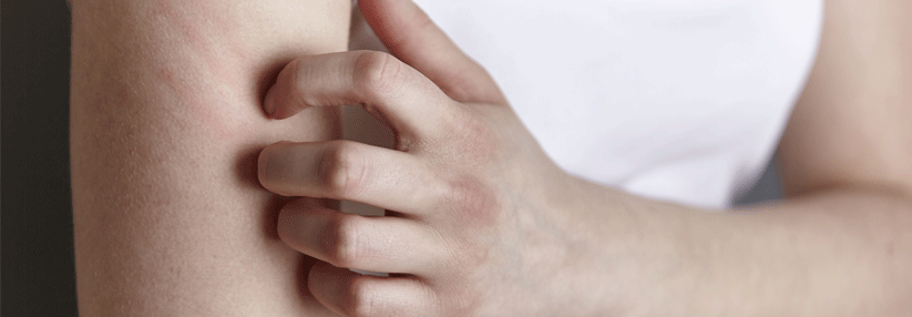 Bei der körperlichen Untersuchung fällt den Ärzten in der Notaufnahme ein makulopapulöses ekzematiformes exkoriiertes Erythem auf, das sich vor allem an Unterbauch, Gliedmaßen, Rücken und Kinn ausbreitet. Spezifische Hinweise auf eine Skabies, wie beispielsweise ein Milbenkopf am Ende eines Bohrgangs, sind dermatoskopisch nicht auszumachen. Es handelt sich also wahrscheinlich um einen generalisierten Juckreiz mit sekundären Läsionen aufgrund des Kratzens.