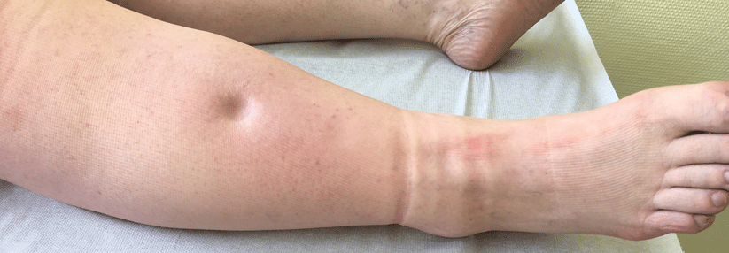 - umschriebene Wulstbildungen (vor allem im Bereich von Oberschenkel- und Knieinnenseite, seltener am Sprunggelenk)