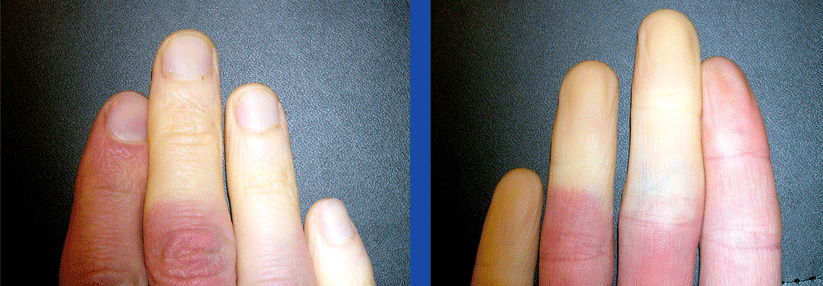 Bei einer Raynaud-Attacke kommt es nach einem Kältereiz oder emotionalem Stress zu einem charakteristischen dreiphasigen Farbwechsel von Weiß (Ischämie) über Blau (Sauerstoffmangel) zu Rot (Wiederherstellung der Blutversorgung). Dies kann mit Schmerzen einhergehen.