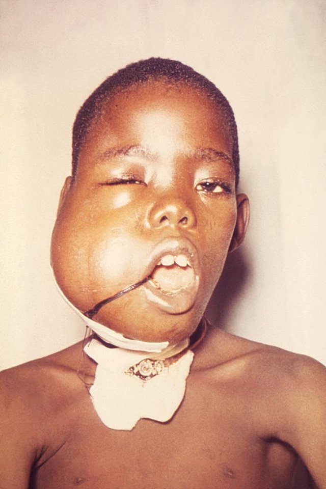 Computertomographie des Halses bei hochmalignem Non-Hodgkin-Lymphom der Halslymphknoten (rekonstruierter Sagittalschnitt)
