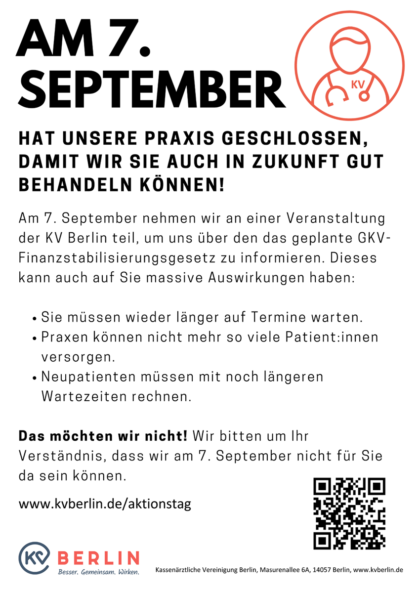 Damit möglichst viele Praxisangestellten kommen können, hat die KV Berlin schon im Juli die Praxen aufgefordert, am 7.9. keine Patienten zu versorgen. Von 10 bis 13 Uhr bietet die KV online eine „Fortbildungsveranstaltung zum GKV-Finanzstabilisierungsgesetz und seine Folgen“ an. Für den Aushang in den Einrichtungen hat die KV ein Plakat vorbereitet. Den Aktionstag begleitet die Körperschaft auf Twitter unter #PraxenProtestieren0709.
