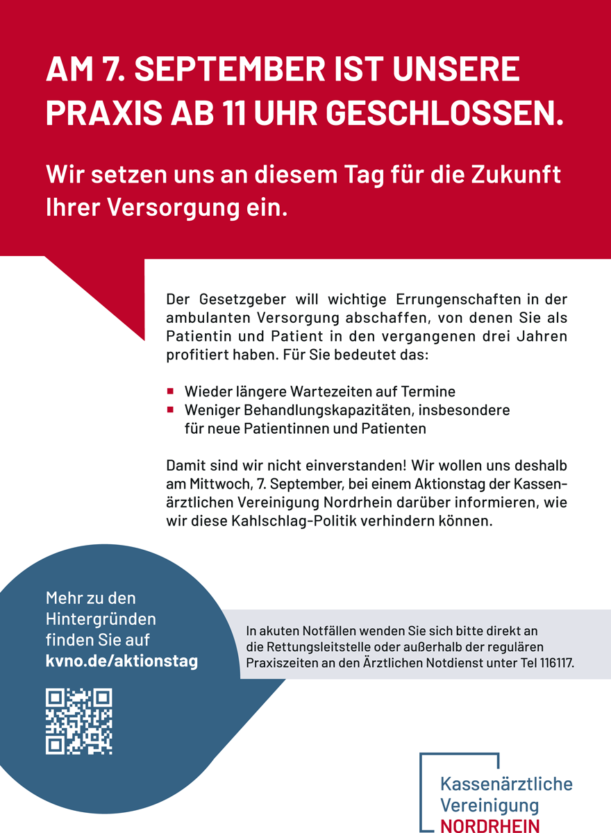 Die KV Nordrhein bietet am 7.9. von 11 bis 13 Uhr Online-Infoveranstaltungen für Ärzte und Psychotherapeuten zum GKV-FinStG sowie eine weitere für MFA zur Telematikinfrastruktur und IT-Sicherheit an. Dass die Praxen dafür schließen, soll ein „deutliches Zeichen in Richtung Politik“ sein, die Abschaffung der Neupatientenregelung zu überdenken. Zur Information der Patienten hat die KV einen Flyer und ein Praxisplakat entworfen.