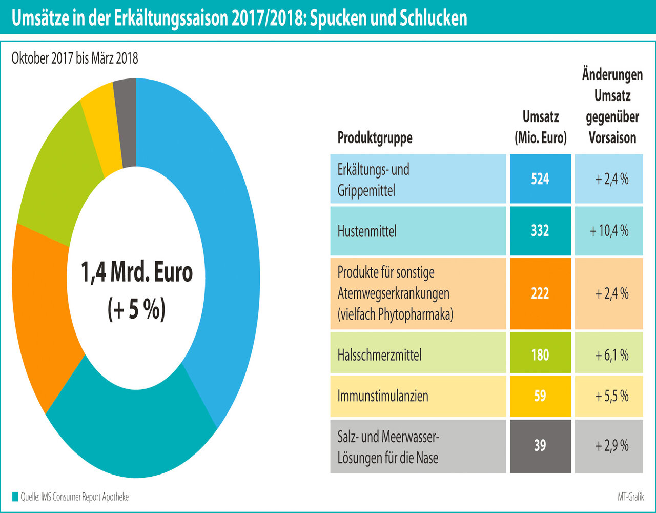 Durchschnittlich zweimal pro Jahr erwischt es einen Erwachsenen. Die Spitzen der Erkältungswellen 2017/18 (gemessen an den Apothekenumsätzen) waren Ende Dezember und besonders stark ausgeprägt – auch deutlich mehr als in den drei Jahren zuvor – im Februar/März 2018. 88 % der Erkältungsmittel wurden 2017 in den Apotheken vor Ort gekauft, der Anteil der per Post zugestellten Packungen (12 %) wuchs allerdings mit 8,4 % stärker als der Offizin-Absatz (+1 %).