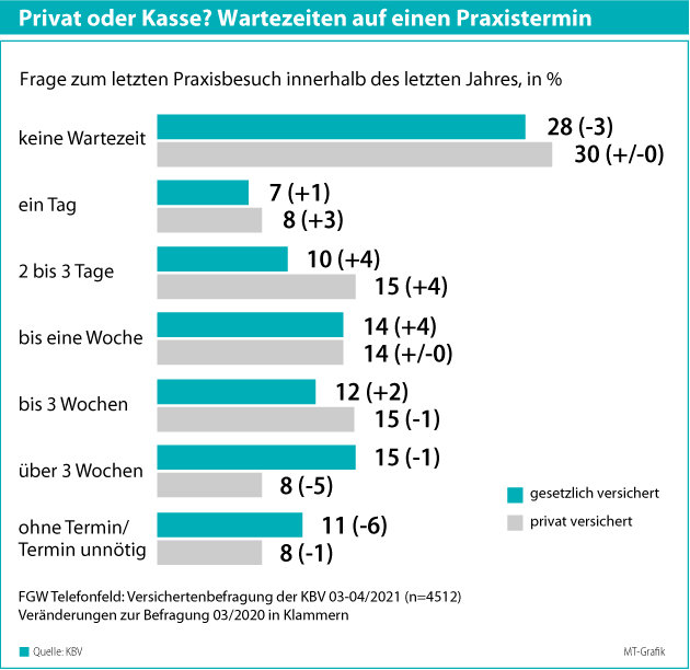 Beim „Politikum“ der unterschiedlich langen Wartezeiten von GKV- und PKV-Kunden (s. Grafik) stellt Matthias Jung von der Forschungsgruppe in den vergangenen zehn Jahren eine Angleichung fest.