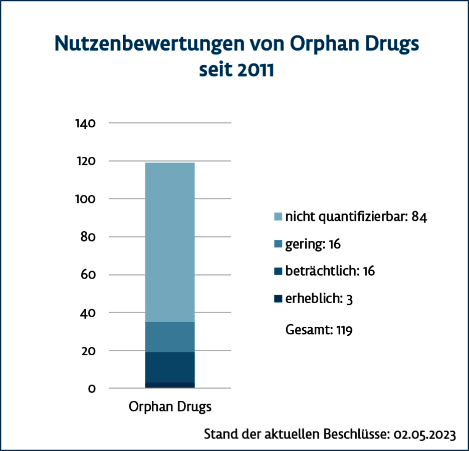 Laut Prof. Hecken kommen Orphans unter einer Umsatzschwelle von 30 Mio. Euro pro Jahr recht problemlos durch die Zulassungsverfahren, weil bei einem neuen Wirkstoff der Zusatznutzen fiktiv als belegt gilt. Selbst dann, wenn keine ausreichende Evidenz für eine Nutzenbewertung vorliege, bekomme der Wirkstoff immer noch einen nicht quantifizierbaren Zusatznutzen zugesprochen. Damit sei die Erstattung „eigentlich relativ safe“ und ebenso der Einsatz in der real existierenden Patient:innenversorgung. Es habe viele Jahre gegeben, in denen mehr Orphans als andere neue Wirkstoffe bewertet wurden. Jetzt seien reguläre Zulassungen in der Überzahl (aktueller Stand siehe Grafik).