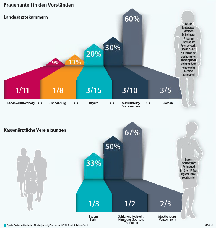 In allen Vorständen der Landesärztekammern arbeiten ebenfalls Frauen. In den einzelnen Kammerversammlungen liegt der Frauenanteil zwischen 13 und 41 %.