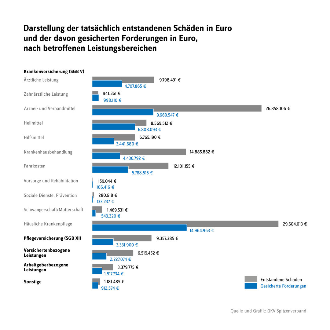 Insgesamt zeigte sich 2020/2021 ein Schaden für die gesetzliche Kranken- und Pflegeversicherung von rund 132 Millionen Euro, von dem nur weniger als die Hälfte von den Kassen erfolgreich zurückgeholt werden konnte. Die Höhe der gesicherten Forderungen sei dennoch weit überdurchschnittlich und erreiche mit nahezu 59,60 Mio. Euro den zweithöchsten Wert seit dem Beginn der Berichterstattung (2018/2019: 62.012.385 Euro).