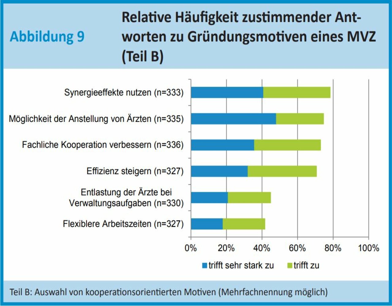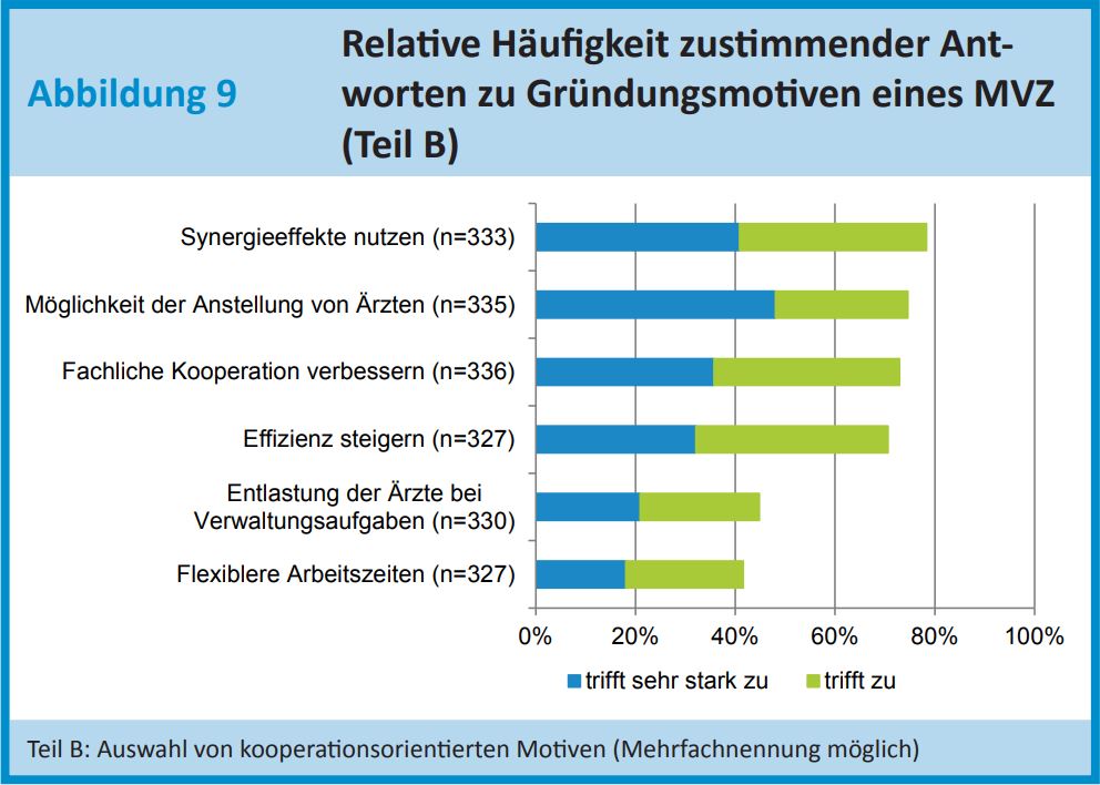 Auf die Frage, warum überhaupt ein MVZ gegründet wurde, antworteten jeweils rund 80 % mit, um „die Position am ambulanten Markt zu erweitern“ und um „Synergieeffekte zu nutzen“. Gut jedes vierte MVZ gab als Begründung die „Verbesserung der Wettbewerbsfähigkeit“ an.