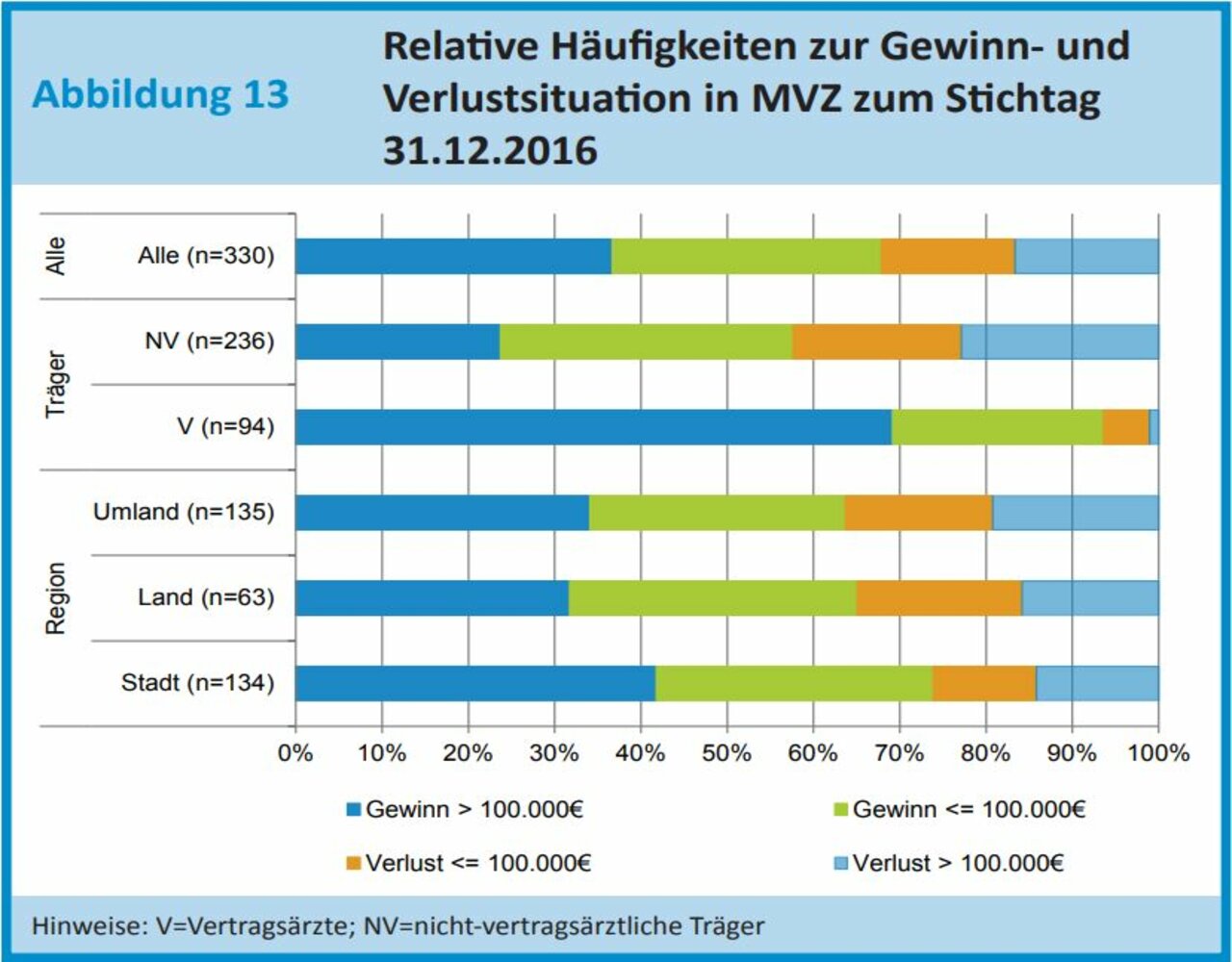 Unter den vertragsärztlich geleiteteten MVZ machten rund 6 % Verluste. Bei den von einem Krankenhaus oder einer Kommune geleiteten Zentren waren es 42 %, die ein ein Minus auswiesen. Dabei kommt es laut Zi nicht allein auf die Frage des Trägers an, auch der Standort spielt eine Rolle. 74 % der in Städten angesiedelten MVZ erzielten einen Gewinn.