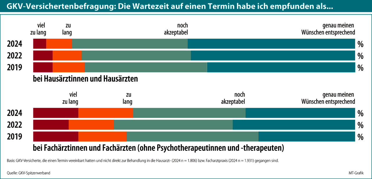Allerdings sind Termine in Hausarztpraxen – anders als bei Facharztpraxen – für die meisten Versicherten kein Problem, wie der GKV-Spitzenverband selbst mit einer Umfrage herausfand: 52 % der Interviewten empfanden 2024 die Wartezeiten als „genau meinen Wünschen entsprechend“, nur 12 % sind unzufrieden (s. Grafik). Die Hälfte der Patientinnen und Patienten wartet nur einen Tag auf einen Termin beim Hausarzt und ein Viertel länger als drei Tage. Dennoch sehen die Kassen Handlungsbedarf bei der Terminvermittlung (s. Kasten).
