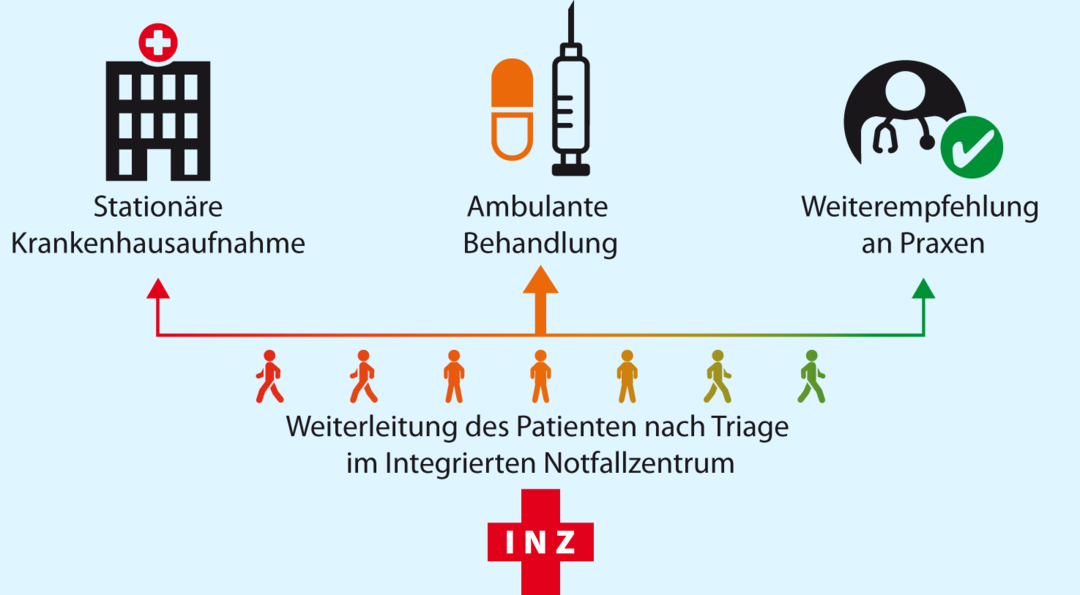 Vorgesehen ist, dass ausgewählte Krankenhäuser gemeinsam mit der KV Integrierte Notfallzentren (INZ) betreiben, wo mittels Triage eine Patientenlenkung stattfindet: Welcher Patient bedarf als echter Notfall der Hilfe des Krankenhauses, wer kann sofort ambulant behandelt werden, wer ist ein Fall für den regulären Praxisbetrieb? Die INZ werden rund um die Uhr geöffnet sein. Ihre fachliche Leitung obliegt der jeweiligen KV.
