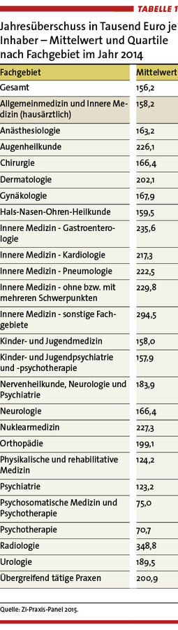 So hatten im Jahr 2014 25 % der Praxisinhaber einen Jahresüberschuss von weniger als 88.500 Euro. 50 % der Praxisinhaber hatten einen Jahresüberschuss von weniger als 136.600 Euro. 75 % der Praxisinhaber hatten einen Jahresüberschuss von weniger als 197.900 Euro (vgl. Tabelle 1).