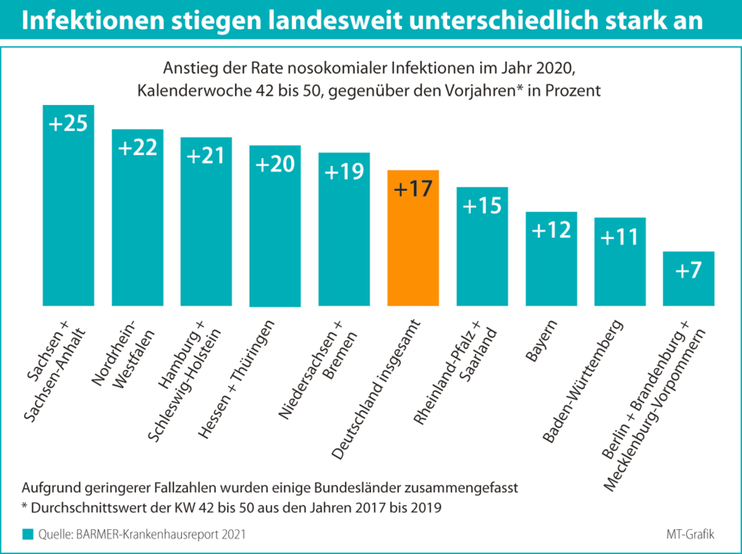 Die Coronapandemie hat diese Situation 2020 nicht verbessert, wie man wegen der gestiegenen Hygieneanforderungen vielleicht vermutet. Im Gegenteil: Laut Krankenhausreport der Barmer gab es hochgerechnet bis Ende 2020 bundesweit etwa 34.000 zusätzlich Infizierte und 600 bis 1.300 weitere Todesfälle aufgrund einer nosokomialen Infektion.