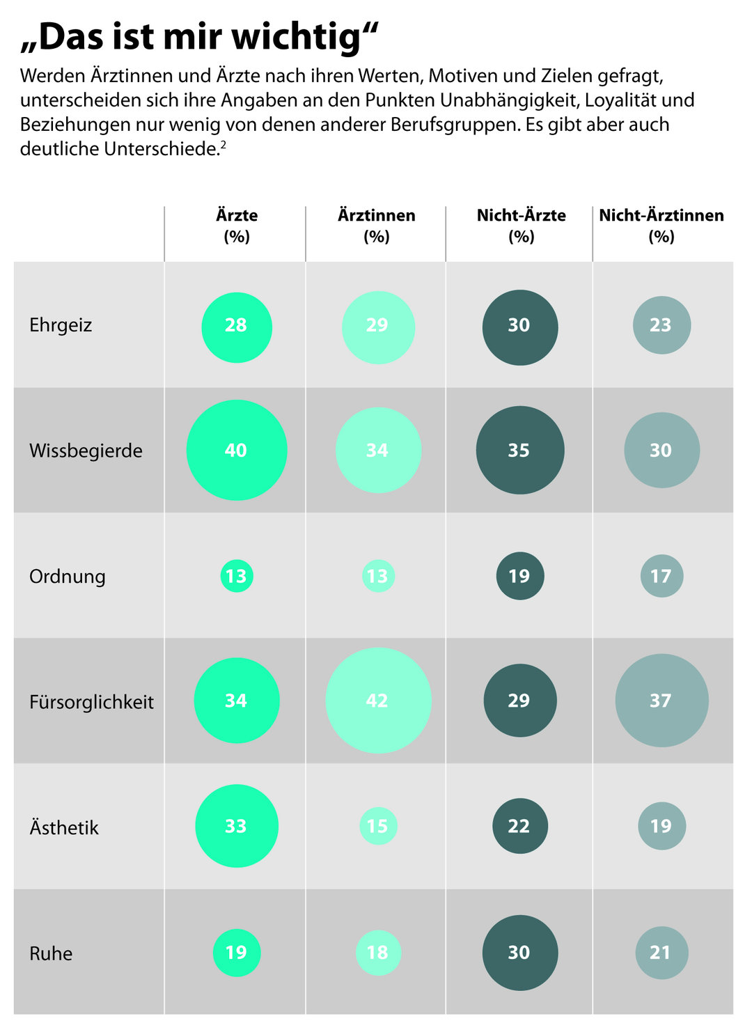 - Für Ärztinnen wie Ärzte ist es eher wichtig, sich in einer Partnerschaft viel Raum zu geben. Zwei Antworten durften gegeben werden auf die Frage „Was scheint Ihnen in einer Partnerschaft am wichtigsten?“. 32 % der Ärzte und 33 % der Ärztinnen entschieden sich für „Einander viel Raum geben“, aber nur 26 % der Nicht-Mediziner und 31 % der Nicht-Medizinerinnen. Von allen am häufgsten genannt wurde „Wünsche aufeinander abstimmen“.