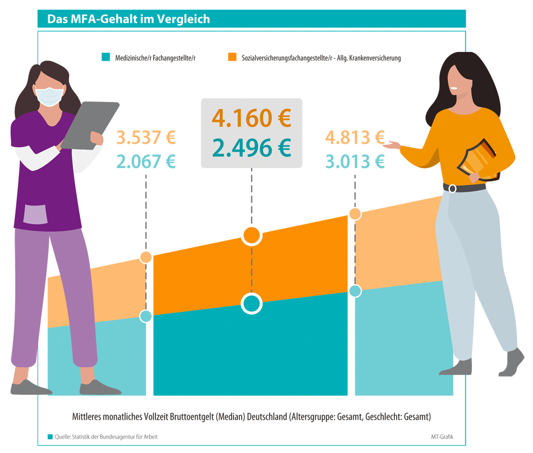 Aus Arbeitgebersicht war die zunehmende Abwanderung ausgebildeter MFA in Richtung Kliniken und der wachsende Gehaltsabstand zu den Pflegefachkräften ausschlaggebend für den letzten Tarifabschluss. Denn auch in der stationären Versorgung liegt das monatliche Einstiegsgehalt einer MFA im Krankenhaus um rund 500 Euro höher als das einer MFA in Arztpraxen.