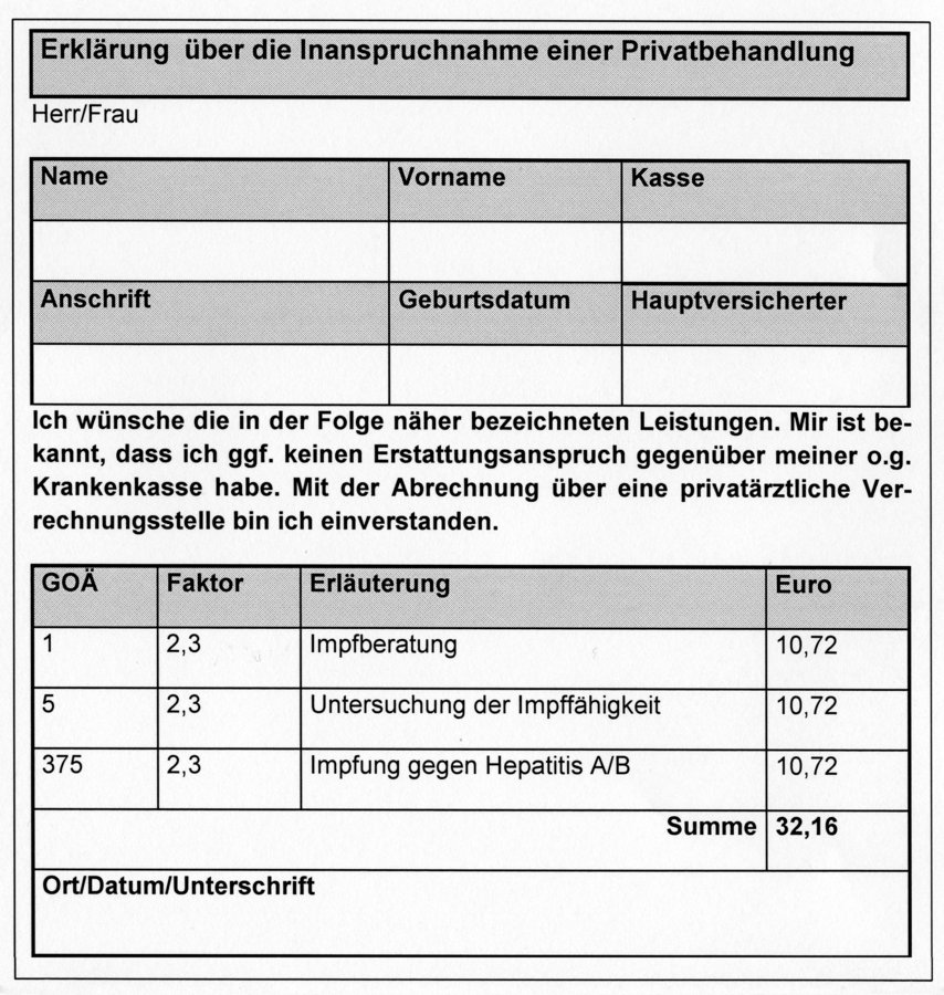 Impfungen vor Auslandsaufenthalten sind keine Kassenleistung, die Leistung zählt also genauso wie das Impfgespräch zu den Individuellen Gesundheitsleistungen (IGeL) und erfordert damit einen schriftlichen Behandlungsvertrag. Dabei kann z.B. durch einen Wartezimmeraushang darüber informiert werden, dass für diese Impfleistungen eine Privatrechnung erstellt wird. Zum Ansatz kommt Nr. 1 GOÄ für die Beratung oder Nr. 3 für die das gewöhnliche Maß übersteigende Beratung von mind. 10 Minuten Dauer. Hinzu kommen dann die jeweiligen Impfleistungen je nach Umfang (Nrn. 375 bis 378).