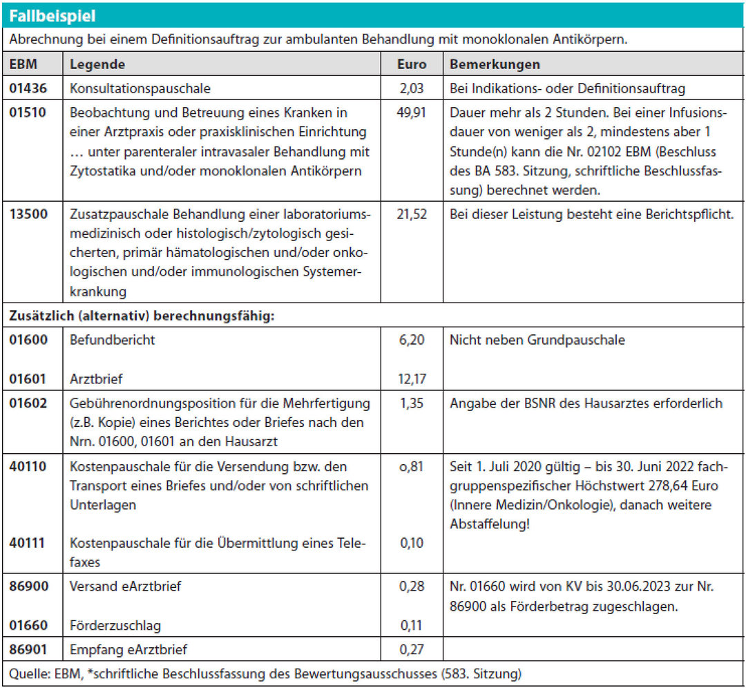 Wichtig: Beim Quartalswechsel sind die Nrn. 01600/01601 EBM im Folgequartal berechnungsfähig, wenn im Vorquartal die Grundpauschale angesetzt wurde, die Behandlung aber nicht abgeschlossen werden konnte. Voraussetzung ist, dass zuvor keine Leistungen erbracht wurden, die einer Berichtspflicht unterliegen. Da im internistisch-onkologischen Bereich des EBM diesbezüglich nur die Leistungen nach den Nrn. 13500 bis 13502 EBM betroffen sind, ist der Ansatz der Nrn. 01600/01601 EBM hier relativ häufig, wie z.B. im Rahmen des in der Tabelle geschilderten Falles, möglich. Wenn ein Arztbericht berechnet wird oder berechnet werden könnte, ist zusätzlich die Nr. 01602 EBM zzgl. Porto ansatzfähig, wenn eine Kopie an den Hausarzt geschickt wird. Der Abrechnungsposition muss in diesem Fall die BSNR der Hausarztpraxis angefügt werden. Hierzu muss allerdings eine schriftliche Einwilligung des Patienten vorliegen.
