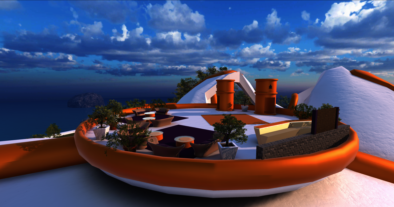 Eine Insel mit Veranstaltungszentrum und Freilichtbühne, die ebenso als virtueller Veranstaltungsort für den MTX-Vortrag am 29.11.2023 um 19 Uhr dient.