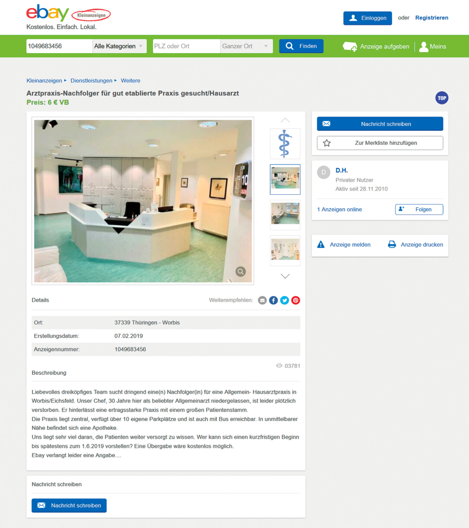 Auf die Idee, die Praxis bei eBay anzubieten, kam er, weil er von einer ähnlichen und letztlich erfolgreichen Aktion im Sauerland gehört hatte. Den Verkaufspreis von 6 Euro in der Anzeige habe er nur deswegen angegeben, weil eBay keine Verkaufssumme von null akzeptiert. Parallel führen Dr. Fincke und Daniel Hoffmann aber auch Gespräche mit der KV Thüringen. Dort hofft man auf die stille Reserve beim Thüringer Hausarztnachwuchs, so KV-Sprecher Veit Malolepsy. Er verweist auf das Seminar- und Mentoringprogramm der KV Thüringen. Aus diesem Programm gehe jedes Jahr eine Gruppe von 20 bis 30 junger Allgemeinmedizinern hervor, zudem gebe es Förderprogramme für sich öffnende Hausarztsitze wie jenen in Worbis, so Malolepsy. Im Kreis Eichsfeld habe man auf diesem Wege in den letzten Jahren zwei Hausarztsitze übergeben können und auch in anderen Regionen Thüringens gebe es Erfolge zu vermelden.