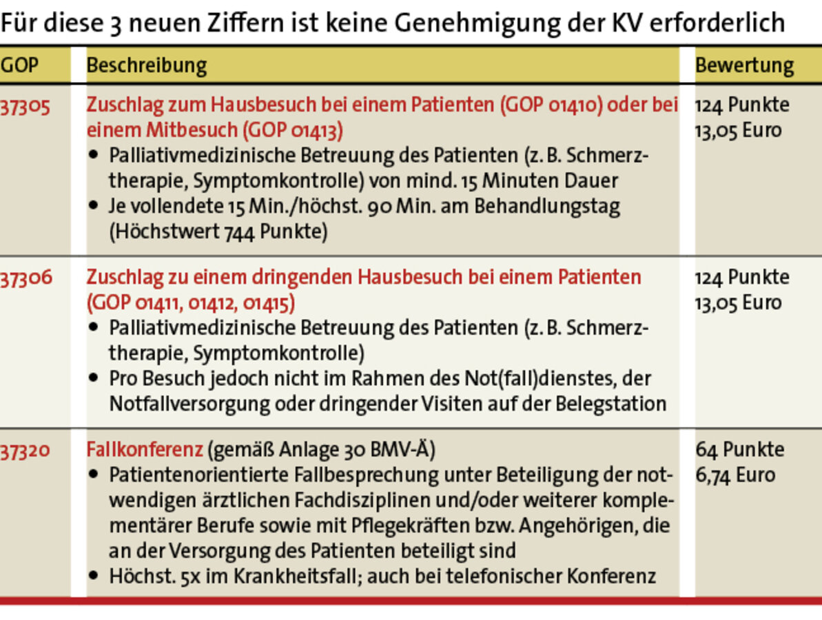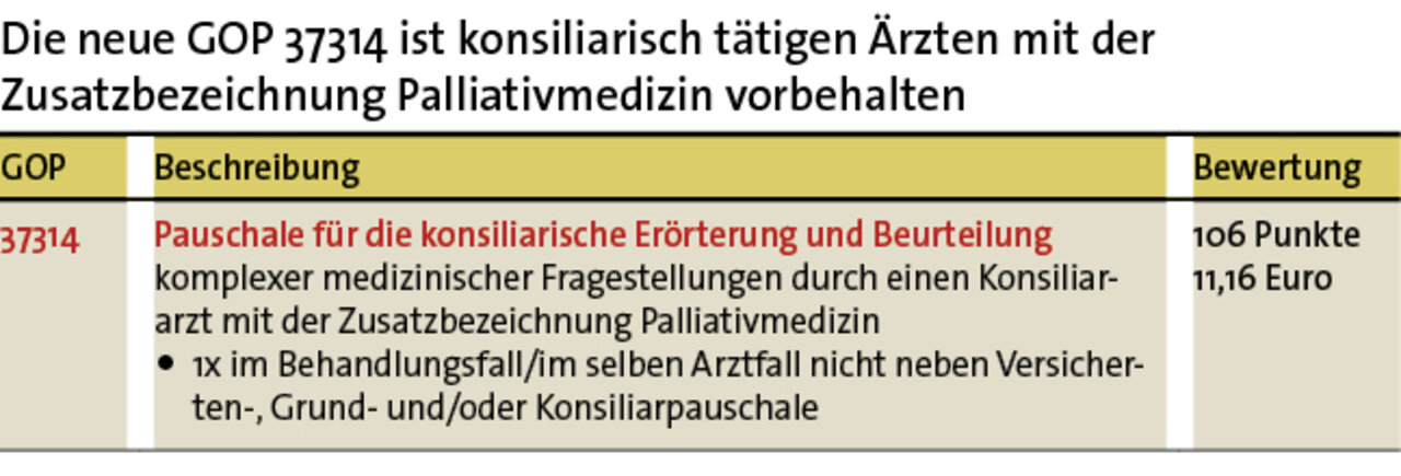 Eine weitere neue Leistung ist konsiliarisch tätigen Ärzten mit der Zusatzbezeichnung Palliativmedizin vorbehalten (Tabelle 3).