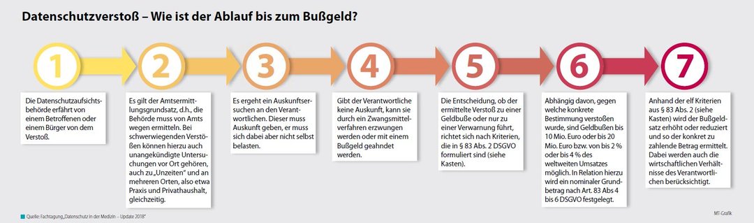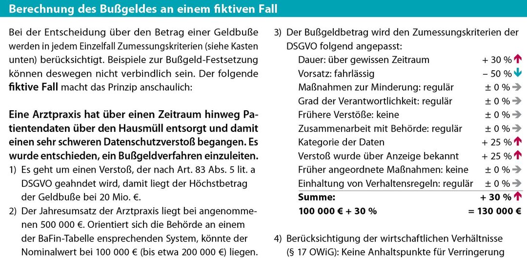 Aktuell liegen die Obergrenzen für Bußgelder bei Datenschutzverstößen noch bei 50 000 bzw. 300 000 Euro, abhängig von der Schwere des Verstoßes. Mit dem Wirksamwerden der Datenschutzgrundverordnung (DSGVO) im Mai werden diese Grenzen bei 10 Millionen bzw. 20 Millionen liegen, erklärt Wirtz. Das klingt absurd hoch. Diese Bußgeldhöhen sind natürlich nicht für die Hausarztpraxis im Mainzer Vorort erdacht worden, relativiert die Referentin. Wird ein Datenschutzverstoß festgestellt, muss zunächst geprüft werden, ob es überhaupt zu einem Bußgeld kommt. Das entscheidet sich anhand von Kriterien, die die DSGVO mitliefert (§ 83 Abs. 2, siehe Kasten). Dazu gehören zum Beispiel die Art und Schwere des Verstoßes, der Grad der Verantwortung, etwaige frühere Verstöße und die Kooperationsbereitschaft. Denn eine Datenschutzaufsichtsbehörde hat verschiedene Sanktionsmittel zur Auswahl. Nach den Vorgaben der neuen Grundverordnung (§ 58 Abs. 2) kann sie z.B. zur Abwehr zukünftiger Verstöße eine Warnung aussprechen, während bei andauernden Verstößen eine Verwarnung und irgendwann auch eine Anweisung ggf. mit Zwangsgeldandrohung das Mittel der Wahl ist. Außerdem hat die Behörde in Zukunft die Möglichkeit, eine Zertifizierung zu widerrufen. Und dann kann sie eben auch noch Bußgelder verhängen.Zumessungskriterien für Geldbußen (Auszug Art. 83 DSGVO)