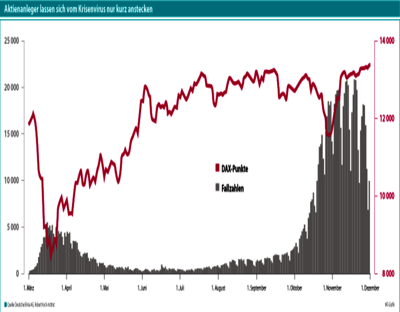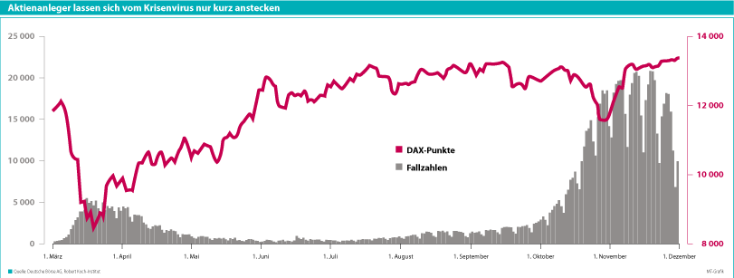Nimmt man die Kursentwicklung an der Börsen als Stimmungsanzeiger für die Erwartungen der Wirtschaft ist die Coronakrise schon abgehakt. Ob DAX, Dow Jones oder MSCI World – die Aktienindizes waren Anfang Dezember wieder auf dem Niveau vor der ersten Pandemiewelle oder bereits darüber hinaus. Der Deutsche Aktienindex DAX hat seit 1970 insgesamt 13 größere externe Schocks durchlebt, trotzdem ist er in den letzten 50 Jahren um über 2000 % gestiegen, berichtet Klaus Niedermeier, Leiter Investment Research der apoBank. Zuletzt gaben vor allem die Nachrichten über die Fortschritte bei der Impfstoffentwicklung den Börsen neuen Schub.