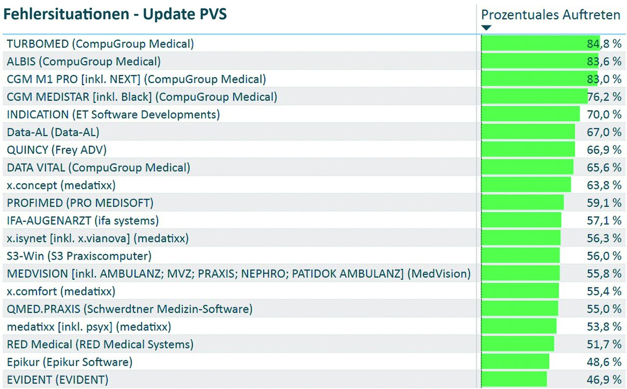 - 17 Situationen, in denen Anwender Fehler bemerkt haben (z. B. nach Updates, bei der Online-Terminvergabe oder bei der Kodierung von Diagnosen) sowie die Fehlerhäufigkeit.