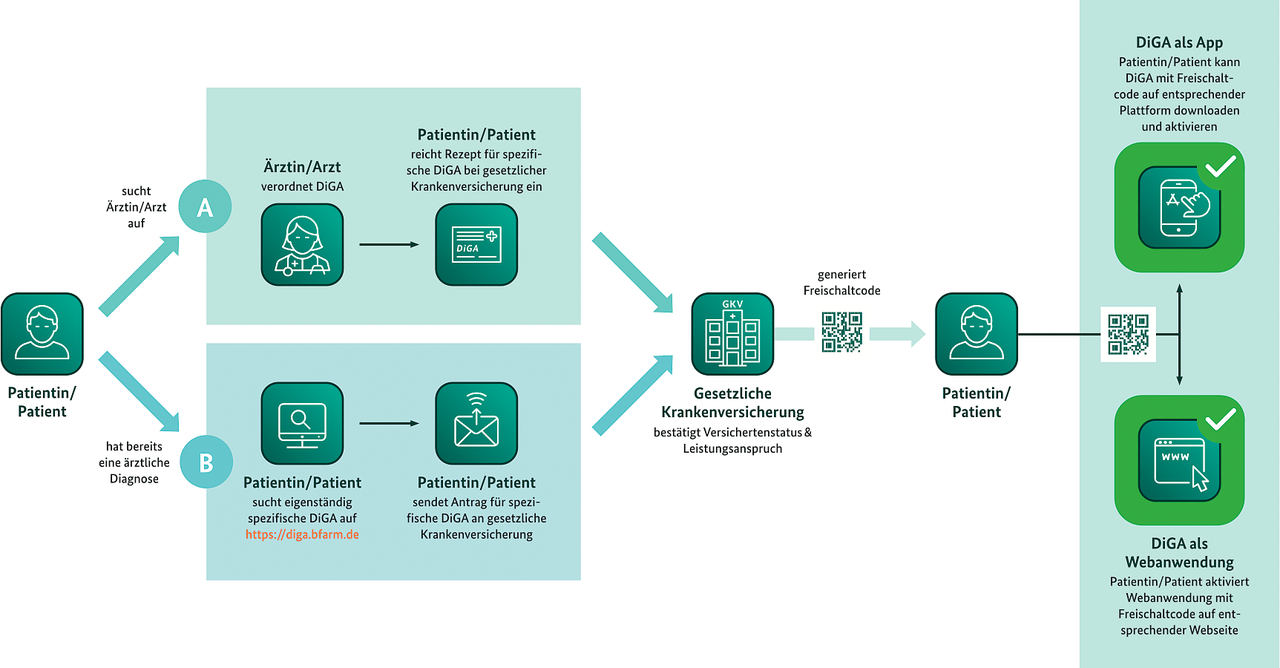 DiGA sind Medizinprodukte der Risikoklasse I oder IIa (MDR). Ihre Hauptfunktion beruht auf digitaler Technologie, mit der wesentlich der medizinische Zweck erreicht wird. Sie werden vom Patienten allein oder von Leistungserbringer und Patient gemeinsam genutzt und dienen dem Erkennen, Überwachen, Behandeln oder Lindern von Krankheiten und Verletzungen bzw. der Kompensation von Behinderungen. Primärprävention gehört nicht dazu.